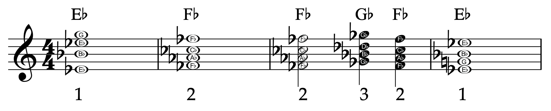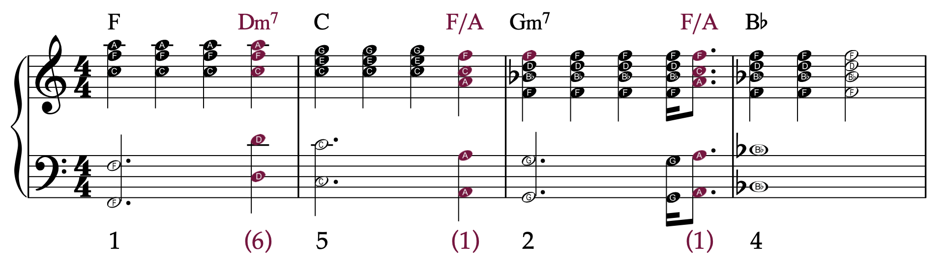 Functionally, the 1 chord moves to the 5 chord through both a shared note and stepwise motion. At the end of this measure, the bassline moves and recontextualizes the chord, while also moving stepwise to the 5 chord. We then get to the 2 chord by its shared note and stepwise motion of the other three notes. This transition is also assisted by the passing chord that happens on the fourth beat of the measure which creates additional stepwise motion in the other direction. Then, the 2 chord moves up to the 4 chord by another transitionary chord and the three notes they share with each other. If you look at the pitches of the Gm7 chord, you will see that the B♭ triad is actually present in the chord. The movement in the baseline completely recontextualized the chord as we enter the 4th measure. While not pictured, the 4 chord will eventually loop back to the 1 chord using its shared pitch, ‘F.’