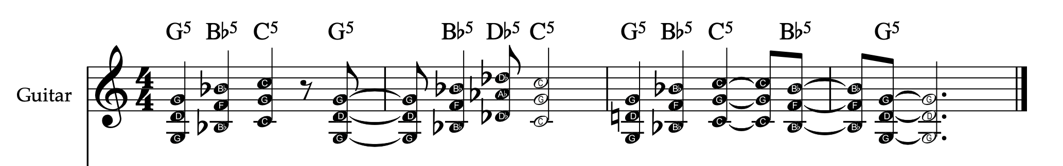 As mentioned before, new performance/compositional techniques would also be found in the evolution of rock and metal, especially with guitarists. You may have heard the term power chord used before, and it refers to a chord that only has 2 distinct pitches. When looking back at our neatly stacked triads, we can create power chords by removing the middle note of the triad, creating just an interval of a fifth. When played on a guitar, the bottom of these notes is usually repeated at the octave to beef up the sound - which is also supported by how easily the hand position is formed by these types of chords. An extremely popular song (at least in terms of rock) represents the use of the power chord. Listen to this snippet of Smoke on the Water by Deep Purple below.