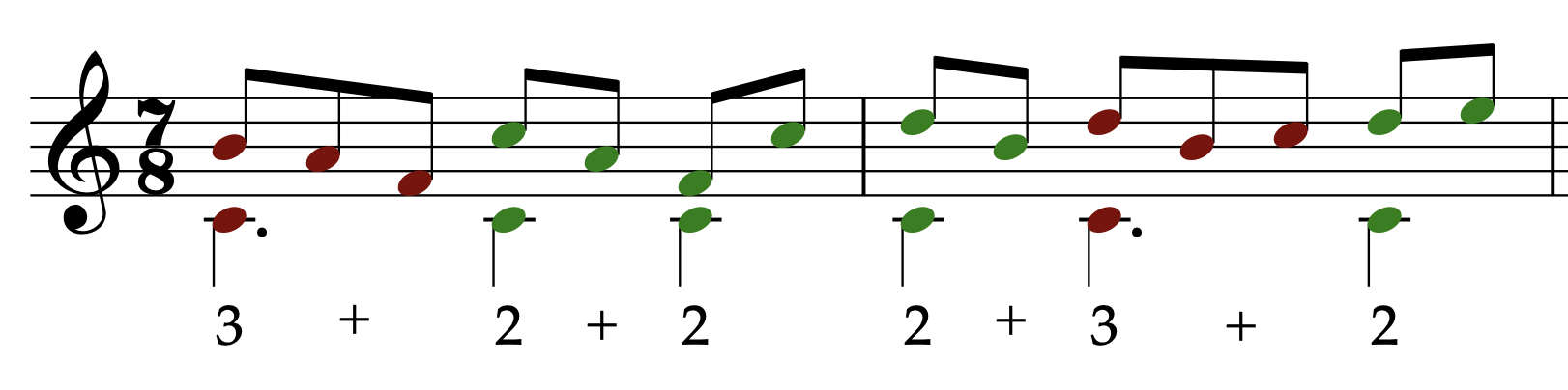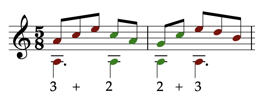 Odd-meter refers to a meter that mixes both compound and simple-macro beat units. Some common odd-meter time signatures include 5/8, 7/8, and 8/8. Each measure of these time signatures includes 5, 7, and 8 eighth notes respectively. An interesting feature of odd meters is that the metric emphasis can easily be changed by just moving around where the compound and simple beats are placed. See the examples to the right here where the groups of 3 are labeled and shaded red, while the groups of 2 are shaded green. These meters are inherently unbalanced and can be hard to follow, especially with how ingrained even meters are in modern pop music. However, while they lack a certain balance, you will soon realize that these kinds of meters can create a kind of regular groove that is easy to follow along with by virtue of repeating and reinforcing said metric patterns.