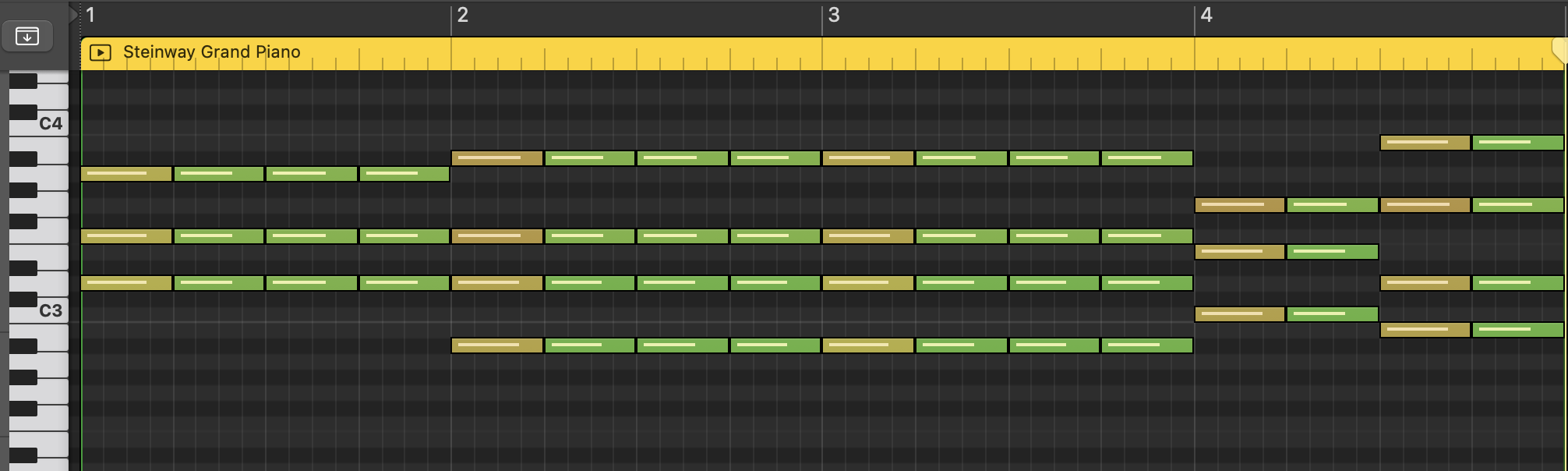 The yellow shaded notes on the DAW represent a higher velocity, thus a more accented sound.