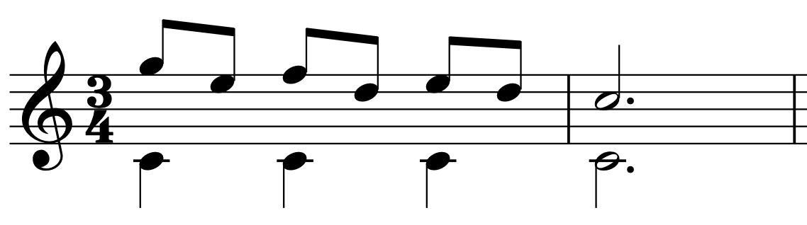 This song also features our first example of polyrhythms - well, at least of this module. It happens throughout the piece, but it is easily heard in the outro shortly after the aforementioned syncopation. Here, Amy and Jen Majura perform compound macro-beat figures over the simple 2/2 meter. You can see I’ve transcribed the figure to the right. In a way, this polyrhythm figure can be heard as “squeezing in” 3 quarter notes in the space of 2, creating a very common device in simple meters called the triplet. Listen along to this section again while following the music. You can also tap out this specific rhythmic pattern to practice it yourself, and you can easily feel the bounciness to this figure compared to the steady macro-beat underlying it. The triplet is such a common trope across all music, that it hardly stands out as an event in this case. In fact, now that you’ve analyzed it in this way, you’ll likely be able to point it out in your every day listening.