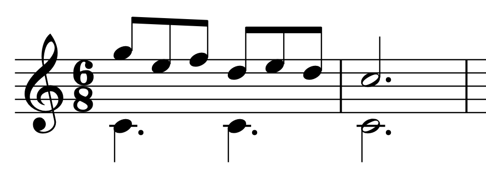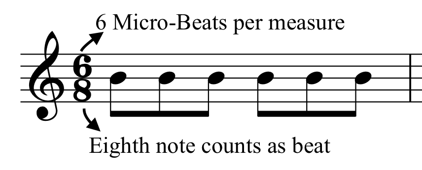 Compound-meter refers to a meter whose macro-beats are divided evenly into three micro-beats. However, and this is where it gets tricky, the bottom note tells us which note is the micro-beat. The top number then tells us how many micro beats make up a measure. By grouping micro-beats into groups of three, we can find the macro-beat unit. A common compound-meter is 6/8, where the 8th note is the micro-beat, and there are six micro-beats per measure. If we take these micro-beats into groups of three, we also see the macro-beat is the dotted quarter note. As you can see now, the dotted quarter is just the value of 3 eighth notes - a dot adds half of the value of the original note. Dotted notes are always going to be the macro-beat unit of any compound meter.