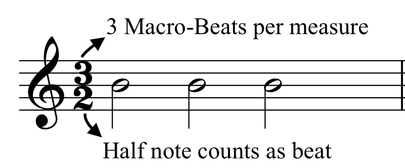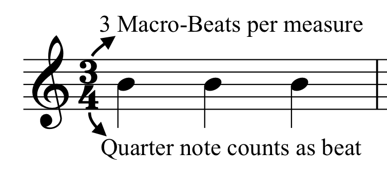 Simple-meter refers to a meter whose macro-beats are divided evenly into two micro-beats. The bottom number of a simple-meter time signature tells us which note gets the macro-beat. Examples of simple-meter are often found in the 3/4 and 4/4 time signatures. In 4/4, the macro-beat unit is the quarter note, and there are 4 quarter notes in each measure. In 3/4, the quarter note still is the macro-beat and there are 3 quarter notes per measure. Another example would be 3/2, where the half note (as determined by the 2 in the time signature) is the macro-beat, and there are 3 half notes that make up a measure.