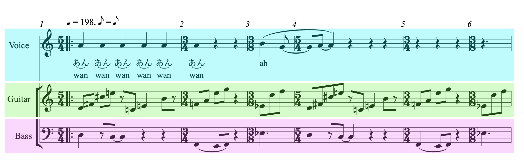 Okay, so there’s a lot going on here. Let me take you through my rationale in making this measure by measure to see what’s happening. I’ve notated the first measure in 5/4, which is best outlined with the 5 quarter notes sung by the vocalists. I then used the last “わん” as the downbeat of the following 3/4 measure, which consists of 3 quarter note beats best emphasized by the guitar and bass. We then come to the last measure, which consists of only 1 compound beat - a complete left turn compared to all of the preceding simple beats. This last measure almost feels like an accident, and can almost be felt as such. Think about tapping out 8 simple quarter-note beats, followed by a 9th beat that’s just a little bit longer. This very long-winded explanation of the notation is exactly why it may have felt like you were “tripping” in your listening. Practice these phrases again while listening, and see if you can keep up better.