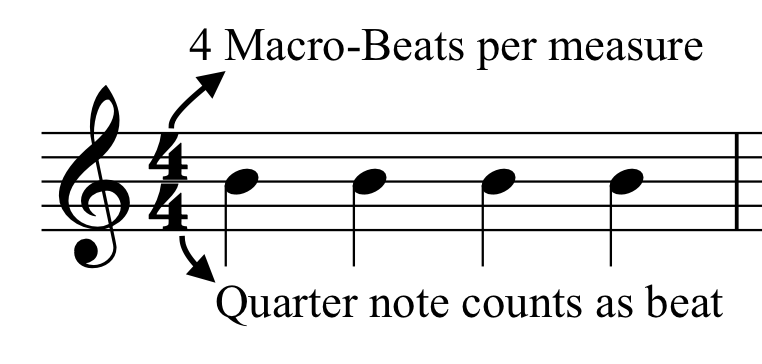Macro-beats are essentially what we have been trying to identify when listening to the songs in this module and from Module 3 - the beat that you tap along to. In some of the most common time signatures, the macro-beat is a quarter note or a dotted quarter note. Hold on to that question for now, as there will be more on dotted notes in a bit.